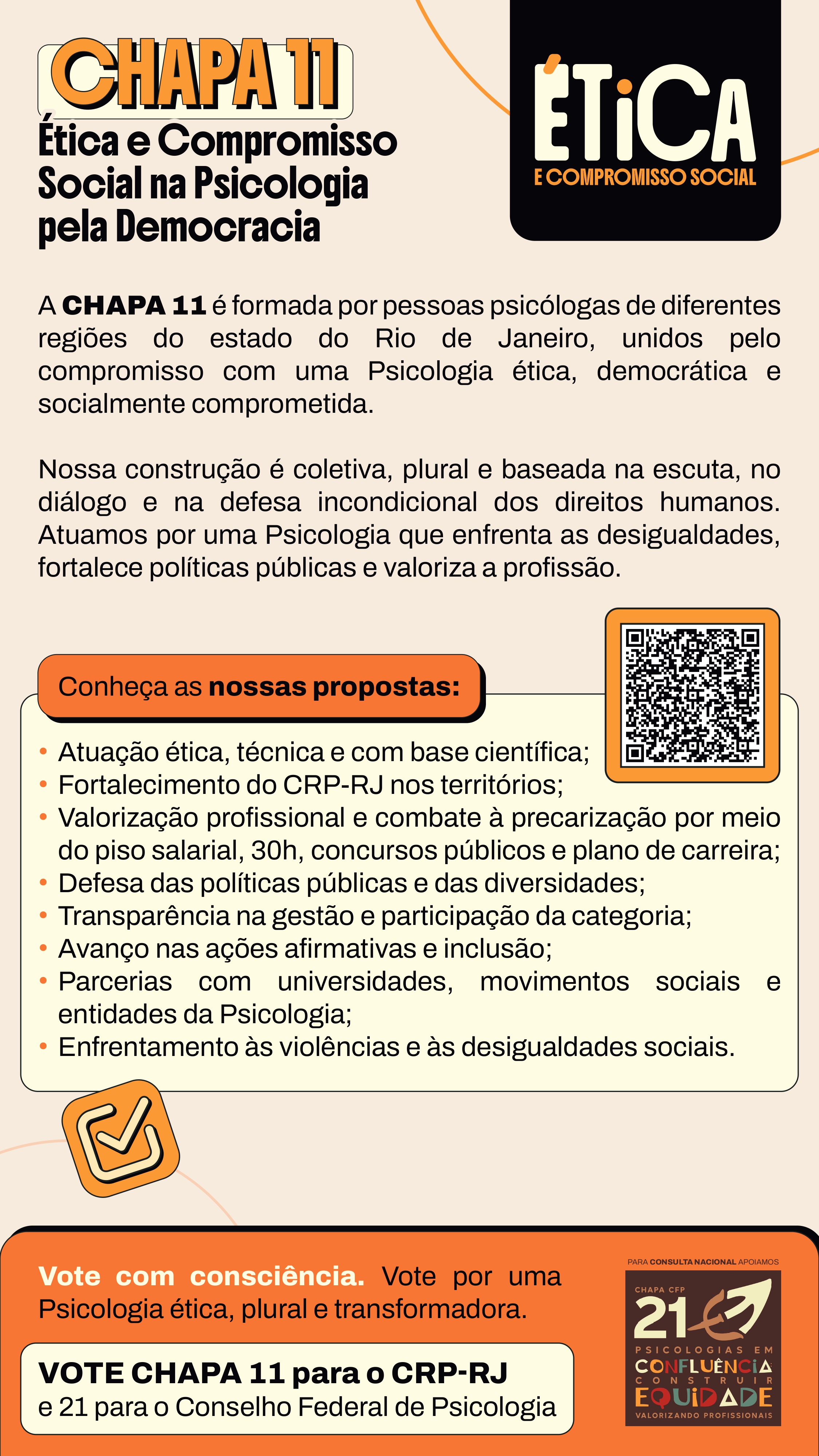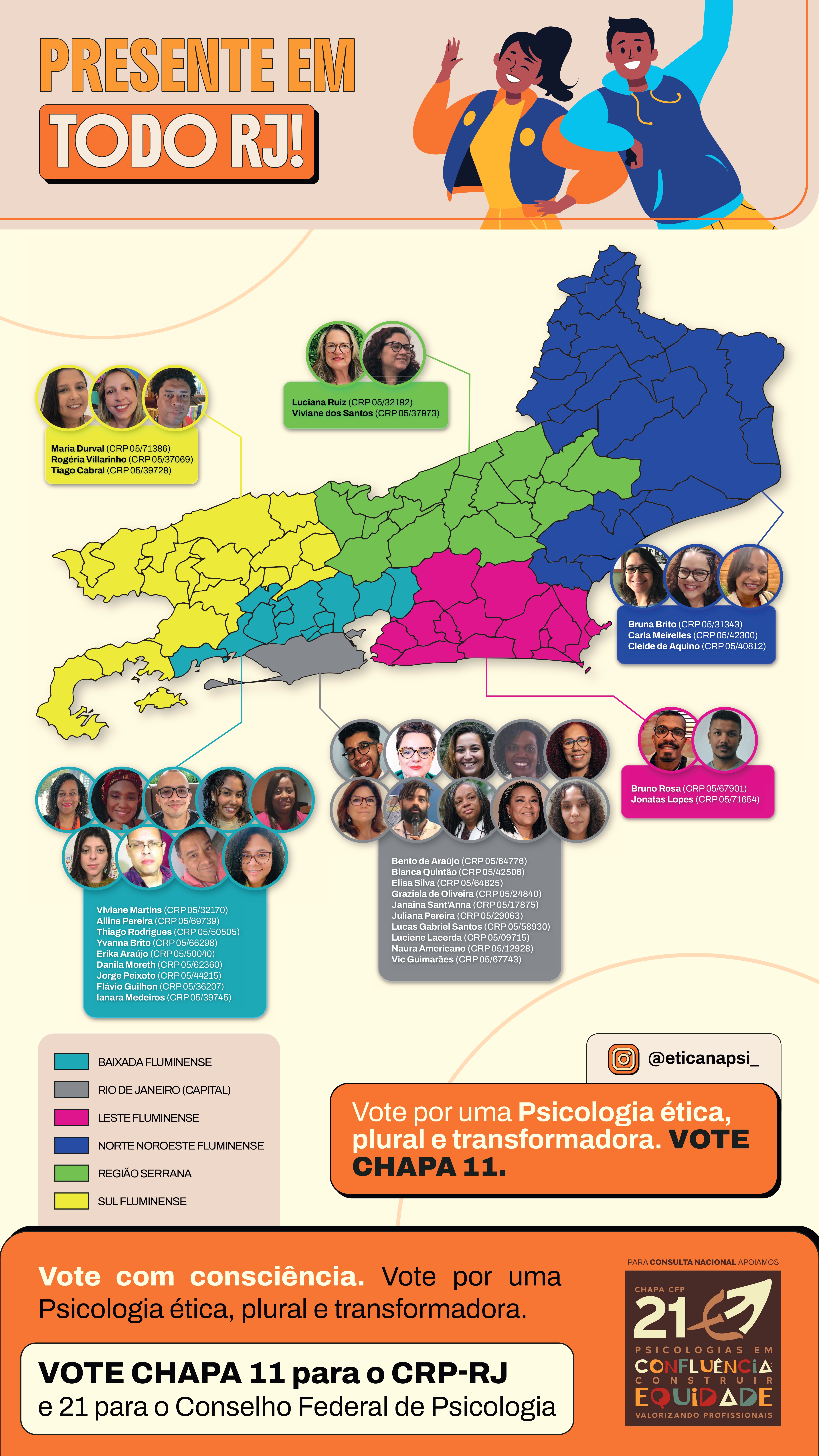 Neste espaço, você tem acesso à lista nominal das chapas que concorrem à Consulta Nacional do CFP. As informações sobre as chapas e candidatas(os) inscritas(os) para os Conselhos Regionais de Psicologia (CRPs), bem como outras informações de interesse, estão disponíveis no site do processo eleitoral: eleicoespsicologia.org.br